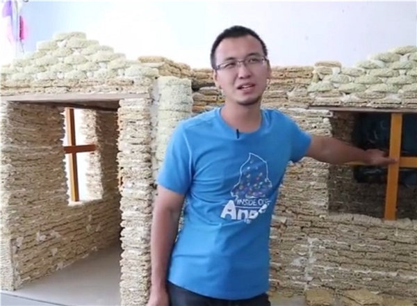 Zhang se pone al frente de la puerta de su casa de cuatro metros cuadrados construida con unas 2.000 bolsas de fideos instantáneos caducados. [Foto de chinadaily.com.cn]