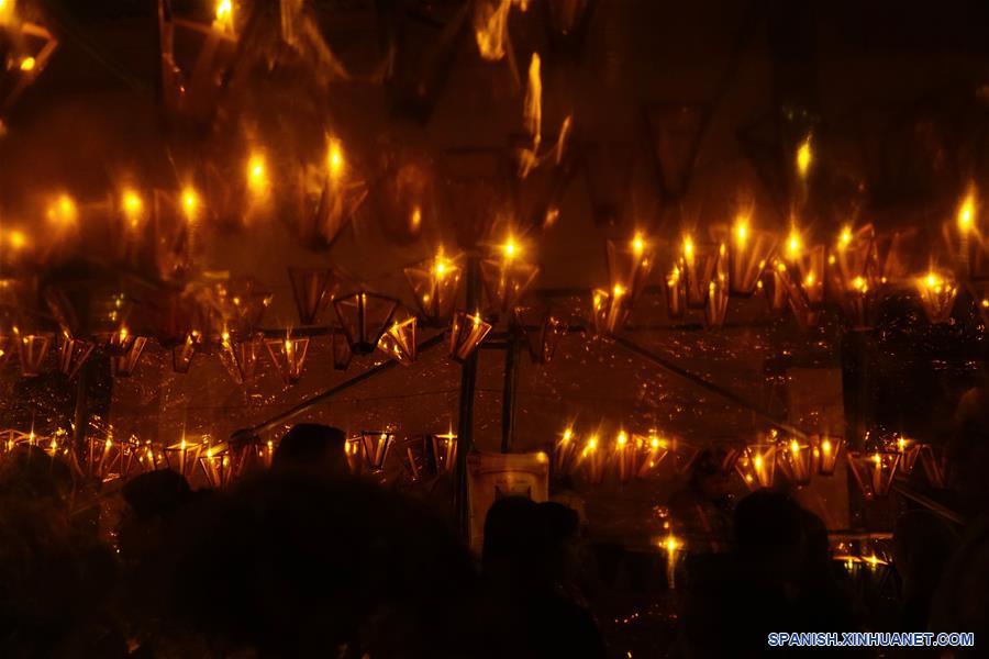 AHUACHAPAN, septiembre 8, 2019 (Xinhua) -- Imagen del 7 de septiembre de 2019 de personas participando en el Festival de los Farolitos, en Ahuachapán, El Salvador. Cada 7 de septiembre estructuras de madera y papel de diversos colores cubren una vela encendida para conmemorar el terremoto de 1850, cuando los pobladores tuvieron que encender rajas secas de ocote para iluminarse mientras dormían y desde ese entonces se lleva a cabo el Festival de Los Farolitos, decretado Patrimonio Cultural Inmaterial por el Congreso salvadore?o en 2014. (Xinhua/Alexander Pe?a)