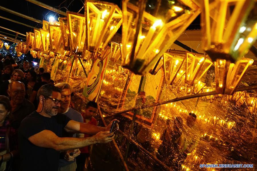 AHUACHAPAN, septiembre 8, 2019 (Xinhua) -- Imagen del 7 de septiembre de 2019 de personas posando en el Festival de los Farolitos, en Ahuachapán, El Salvador. Cada 7 de septiembre estructuras de madera y papel de diversos colores cubren una vela encendida para conmemorar el terremoto de 1850, cuando los pobladores tuvieron que encender rajas secas de ocote para iluminarse mientras dormían y desde ese entonces se lleva a cabo el Festival de Los Farolitos, decretado Patrimonio Cultural Inmaterial por el Congreso salvadore?o en 2014. (Xinhua/Alexander Pe?a)