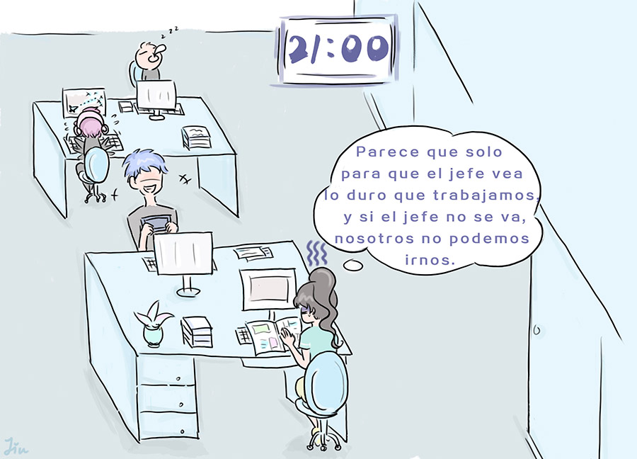 Según Liu Tian, aunque la compa?ía estipula que el registro de entregada debe ser a las 9 de la ma?ana y el de salida a las 6:30 de la tarde, existe un extra?o retraso en la hora de salida en su departamento. "Parece que solo para que el jefe vea lo duro que trabajamos, y si el jefe no se va, nosotros no podemos irnos. Nos quedamos en el trabajo incluso hasta las 9 de la noche".