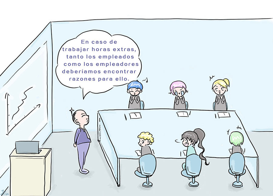 Algunos jefes de empresas también creen que en caso de trabajar horas extras, tanto los empleados como los empleadores deberían encontrar razones para ello. Si es un problema propio de un empleado, se le debe instar a que mejore su eficiencia laboral lo antes posible. Si es debido a una carga de trabajo demasiado grande, la compa?ía debería considerar contratar a más personas para completar juntos dicho trabajo.