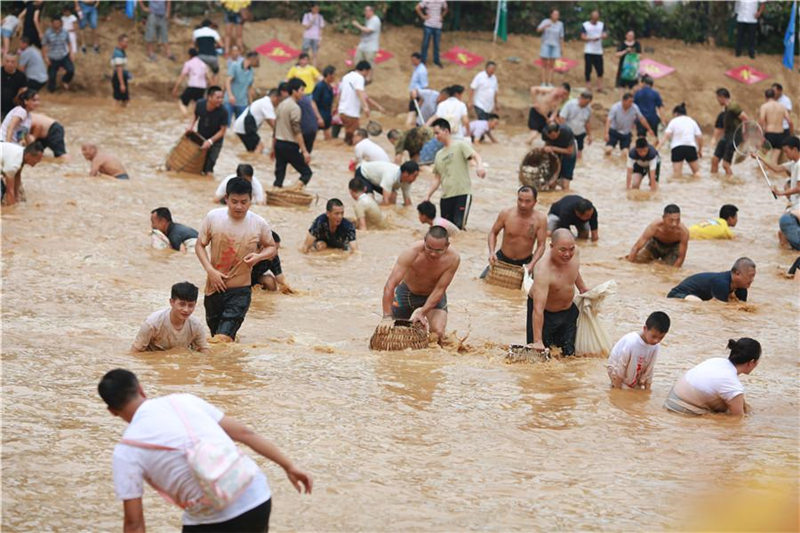 Los visitantes capturan peces en un estanque lodoso durante el “Shaiqiu”, un festival tradicional rural de oto?o que se celebra en Fuling, Chongqing, el 7 de septiembre del 2019. (Foto: chinadaily.com.cn)