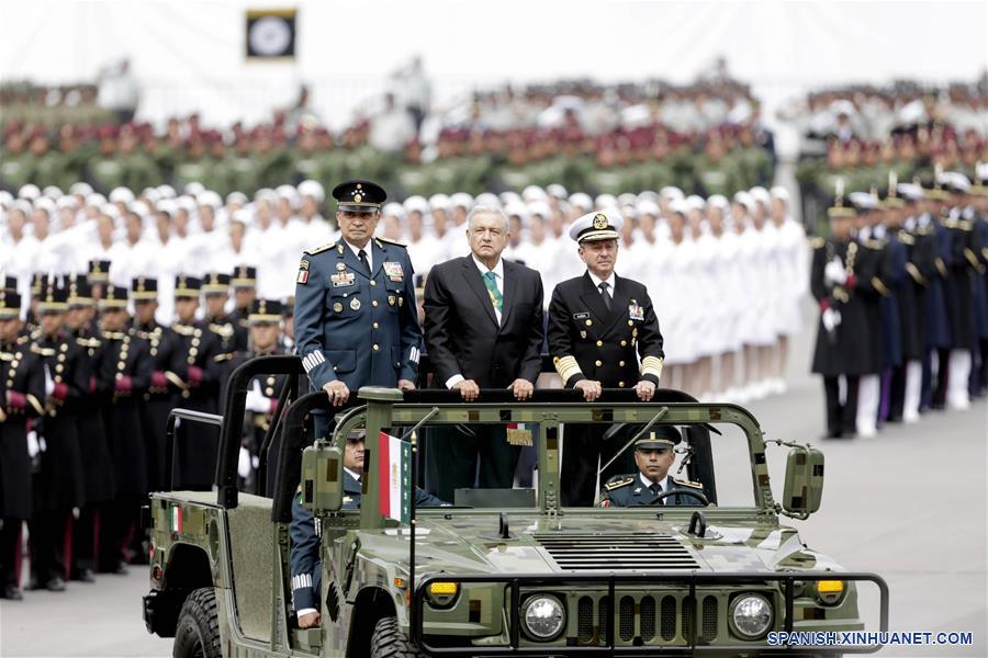 El presidente mexicano, Andrés Manuel López Obrador (c), participa en el Desfile Militar por el 209 aniversario de la Independencia de México, en la Ciudad de México, capital de México, el 16 de septiembre de 2019. (Xinhua/Francisco Ca?edo)