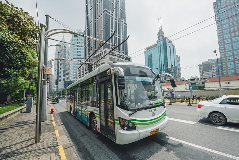 Un autobús híbrido para el servicio público transita por las calles de Shanghai, 5 de mayo del 2016. [Foto: IC]