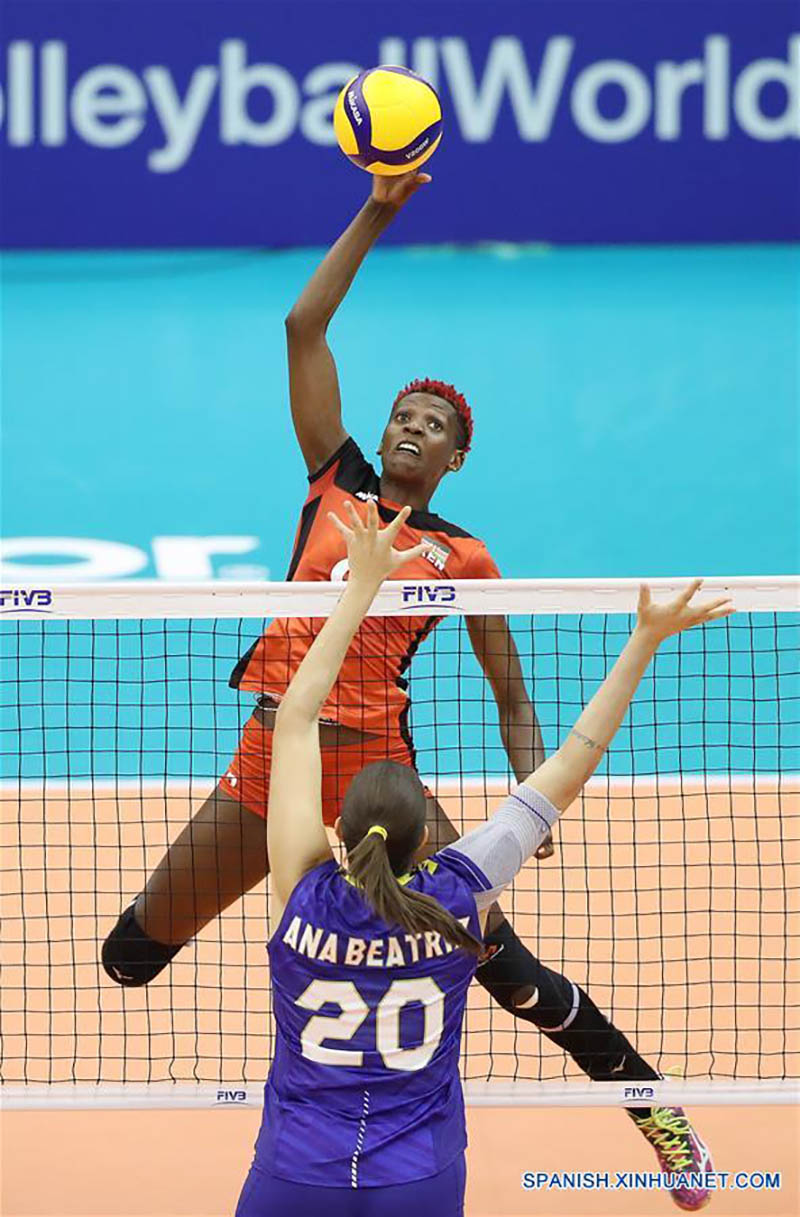 HAMAMATSU, 18 septiembre, 2019 (Xinhua) -- Mercy Moim (arriba), de Kenia, clava el balón durante el partido de round-robin (todos contra todos) de la Copa Mundial Femenina de la Federación Internacional de Voleibol (FIVB) 2019, ante Brasil, celebrado en Hamamatsu, Japón, el 18 de septiembre de 2019. (Xinhua/Du Xiaoyi)