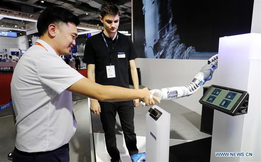 Un visitante saluda a un robot biónico durante la Feria Internacional Industrial China 2019, que se celebra del 17 al 21 de septiembre y cuenta con más de 2.600 expositores provenientes de 27 países y regiones, 17 de septiembre del 2019. (Xinhua / Zhang Jiansong)