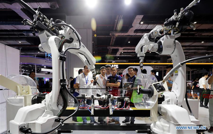 Visitantes contemplan los robots soldadores durante la Feria Internacional Industrial China 2019, que se celebra del 17 al 21 de septiembre y cuenta con más de 2.600 expositores provenientes de 27 países y regiones, 17 de septiembre del 2019. (Xinhua / Zhang Jiansong)