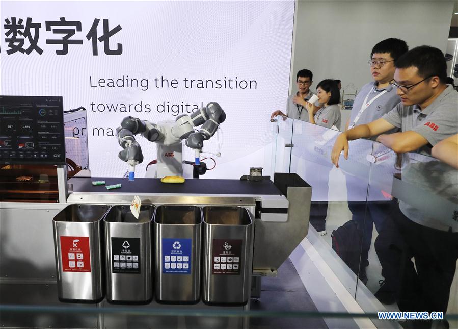 Los visitantes contemplan a un robot que clasifica la basura durante la Feria Internacional de la Industria de China de 2019 en el este de Shanghái. La feria se celebra del 17 al 21 de septiembre con más de 2.600 expositores provenientes de 27 países y regiones. (Xinhua / Zhang Jiansong)