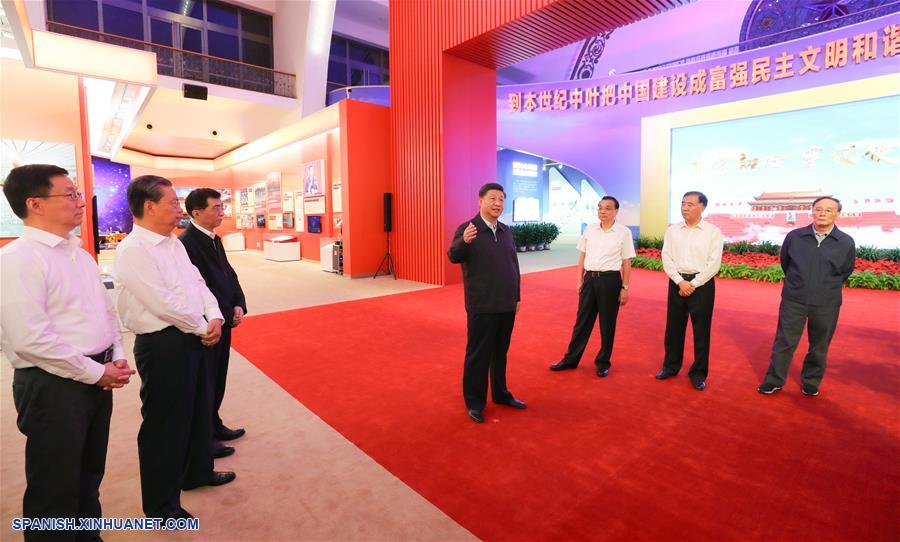 El presidente chino, Xi Jinping, también secretario general del Comité Central del Partido Comunista de China y presidente de la Comisión Militar Central, visita una exhibición de los logros en conmemoración del 70o aniversario de la fundación de la República Popular China, en el Centro de Exposiciones de Beijing, en Beijing, capital de China, el 23 de septiembre de 2019. Los altos funcionarios Li Keqiang, Wang Yang, Wang Huning, Zhao Leji, Han Zheng y Wang Qishan también visitaron la exhibición. (Xinhua/Ju Peng)