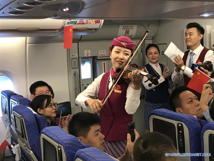 Una asistente de vuelo toca el violín a bordo del vuelo CZ3001 de China Southern Airlines, el 25 de septiembre de 2019. El nuevo Aeropuerto Internacional Daxing de Beijing inauguró sus vuelos con el CZ3001 de China Southern Airlines que despegó el miércoles por la tarde. El vuelo inaugural hizo la ruta entre Beijing y Guangzhou en el sur de China. Después de éste, otras seis aerolíneas chinas iniciaron sus respectivos primeros vuelos vía el nuevo aeropuerto. (Xinhua/Tai Sicong)