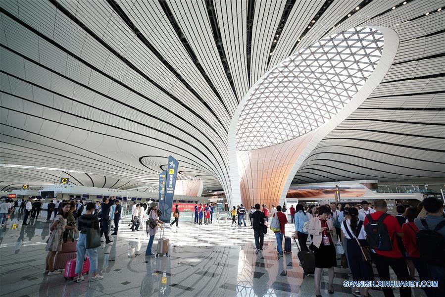 Pasajeros se preparan para abordar los aviones en la terminal del Aeropuerto Internacional Daxing, en Beijing, capital de China, el 25 de septiembre de 2019. El nuevo Aeropuerto Internacional Daxing de Beijing registró el miércoles su primer vuelo, la partida de un avión de la compa?ía nacional China Southern Airlines. Situada a 46 kilómetros al sur del centro de Beijing, la obra tiene la forma de un ave fénix con las alas extendidas. Se espera que para 2025 esté atendiendo 72 millones de pasajeros y manejando 2 millones de toneladas de carga al a?o, con 620.000 despegues y aterrizajes. (Xinhua/Ju Huanzong)