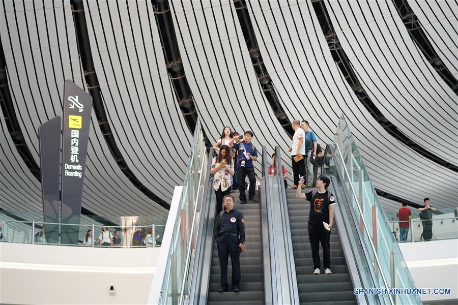 Pasajeros se preparan para abordar los aviones en la terminal del Aeropuerto Internacional Daxing, en Beijing, capital de China, el 25 de septiembre de 2019. El nuevo Aeropuerto Internacional Daxing de Beijing registró el miércoles su primer vuelo, la partida de un avión de la compa?ía nacional China Southern Airlines. Situada a 46 kilómetros al sur del centro de Beijing, la obra tiene la forma de un ave fénix con las alas extendidas. Se espera que para 2025 esté atendiendo 72 millones de pasajeros y manejando 2 millones de toneladas de carga al a?o, con 620.000 despegues y aterrizajes. (Xinhua/Ju Huanzong)