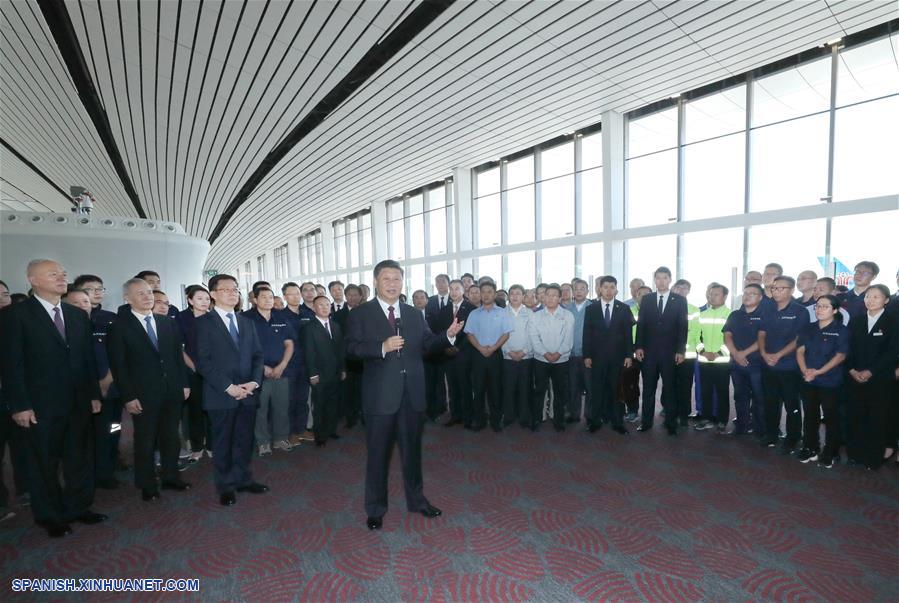 El presidente chino, Xi Jinping, también secretario general del Comité Central del Partido Comunista de China (PCCh) y presidente de la Comisión Militar Central, se reúne con delegados responsables de la construcción y operación del aeropuerto en el Aeropuerto Internacional Daxing de Beijing, el 25 de septiembre de 2019. La ceremonia de apertura de operaciones del aeropuerto se realizó en Beijing el miércoles por la ma?ana. Xi asistió a la ceremonia, anunció la apertura oficial del aeropuerto e inspeccionó sus plataformas y el vestíbulo de facturación. (Xinhua/Ju Peng)