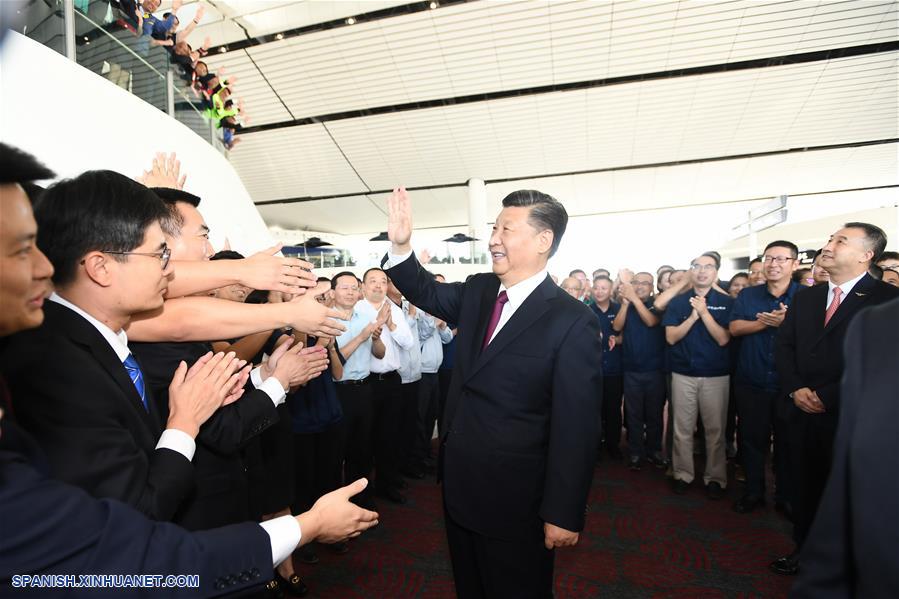 El presidente chino, Xi Jinping, también secretario general del Comité Central del Partido Comunista de China (PCCh) y presidente de la Comisión Militar Central, se reúne con delegados responsables de la construcción y operación del aeropuerto en el Aeropuerto Internacional Daxing de Beijing, el 25 de septiembre de 2019. La ceremonia de apertura de operaciones del aeropuerto se realizó en Beijing el miércoles por la ma?ana. Xi asistió a la ceremonia, anunció la apertura oficial del aeropuerto e inspeccionó sus plataformas y el vestíbulo de facturación.(Xinhua/Xie Huanchi)