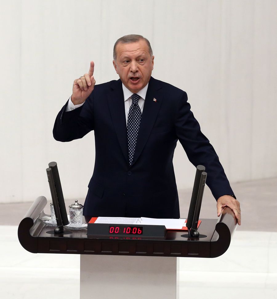 El presidente de Turquía, Recep Tayyip Erdogan, habla durante la ceremonia de apertura del nuevo a?o legislativo del parlamento de Turquía, en Ankara, Turquía, el 1 de octubre de 2019. Turquía no tiene tiempo que perder para establecer una zona segura en la frontera turco-siria, dijo el presidente turco Recep Tayyip Erdogan. (Xinhua/Mustafa Kaya)