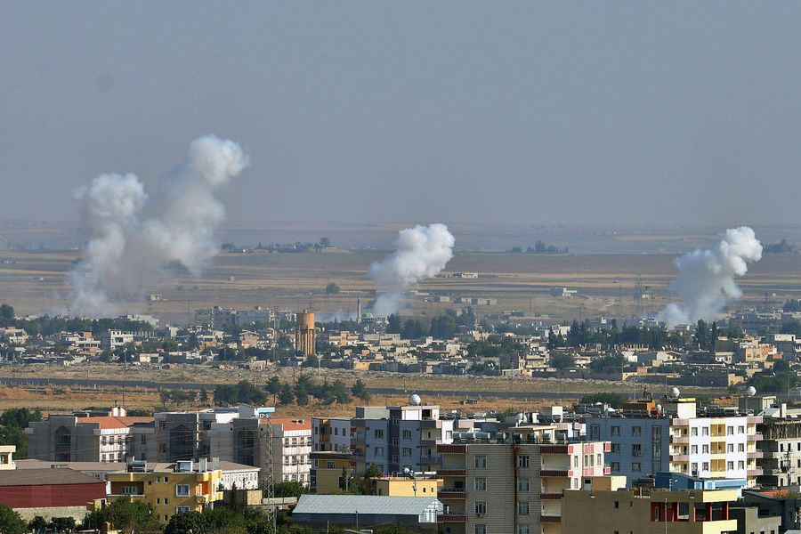 Imagen del 12 de octubre de 2019 tomada desde la ciudad fronteriza de Ceylanpinar, en el sur de Turquía, de humo emanando del norte de la ciudad siria de Ras al-Ain durante un ataque lanzado por el ejército turco. (Xinhua/Mustafa Kaya)