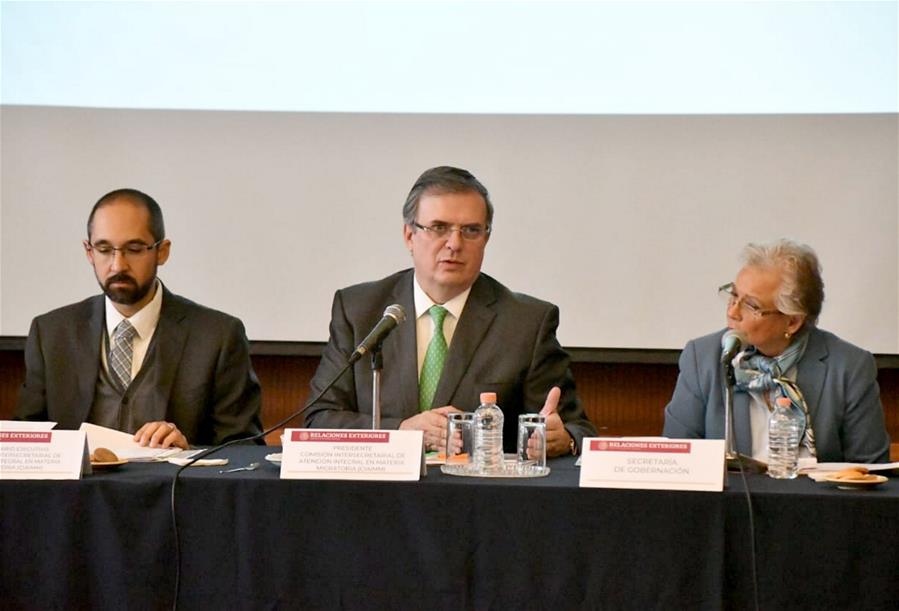 El secretario de Relaciones Exteriores mexicano, Marcelo Ebrard (c), y la secretaria de Gobernación, Olga Sánchez Cordero (d), encabezan la segunda sesión de la Comisión Intersecretarial de Atención Integral en Materia Migratoria, en la Ciudad de México, capital de México, el 16 de octubre de 2019. Autoridades mexicanas aprobaron el miércoles una estrategia de coordinación para atender la migración por México bajo un eje que tome en cuenta ni?os y otros grupos vulnerables, informó la Cancillería. (Xinhua/Str)