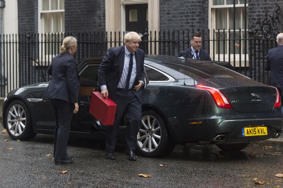 El primer ministro británico, Boris Johnson, regresa al número 10 de la calle Downing después de debatir en el tradicional Discurso de la Reina, en Londres, Reino Unido, el 14 de octubre de 2019. (Xinhua/Ray Tang)