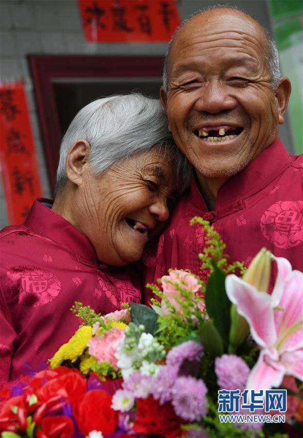 Una pareja de recién casados se abraza en un centro de atención para ancianos en Luonan, provincia de Shaanxi. [Foto / Xinhua]