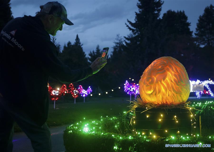 VANCOUVER, 17 octubre, 2019 (Xinhua) -- Imagen del 16 de octubre de 2019 de un visitante tomando fotografías de una calabaza tallada mientras asisten al evento temático de Halloween "Resplandor en el Jardín" en el Jardín VanDusen, en Vancouver, Canadá. (Xinhua/Liang Sen)