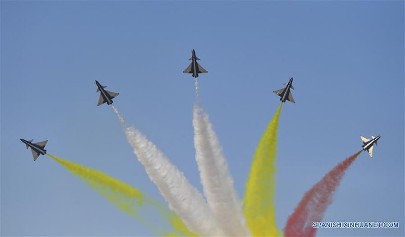 CHANGCHUN, 17 octubre, 2019 (Xinhua) -- El Equipo Acrobático Bayi (1 de agosto) realiza una actuación durante una actividad en celebración del 70° aniversario de la fundación de la fuerza Aérea del Ejército Popular de Liberación (EPL) de China, en Changchun, capital de la provincia de Jilin, en el noreste de China, el 17 de octubre de 2019. La actividad de cinco días, donde la Fuerza Aérea del EPL exhibirá armas y equipos y ofrecerá espectáculos acrobáticos para celebrar su 70° aniversario de fundación, comenzó el jueves. Los espectadores podrán deleitarse con vuelos acrobáticos, espectáculos de paracaidistas, ejercicios de combate de cazas de tercera generación y demostraciones de fuerzas especiales aerotransportadas. Un total de 35 aviones de diez tipos harán presentaciones acrobáticas, como el caza furtivo J-20, el avión de transporte Y-20 y el caza J-16. Además de 19 aviones, la fuerza aérea seleccionó 71 equipos para la exposición estática, con el fin de demostrar su capacidad en combate aéreo, entrega estratégica, alerta y detección tempranas, apoyo de información y defensa aérea y capacidades antimisiles. (Xinhua/Zhang Nan)