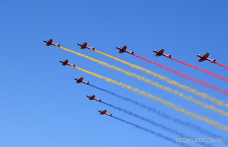 CHANGCHUN, 17 octubre, 2019 (Xinhua) -- El equipo de demostración Sky Wing Air realiza una actuación durante una actividad en celebración del 70° aniversario de la fundación de la fuerza Aérea del Ejército Popular de Liberación (EPL) de China, en Changchun, capital de la provincia de Jilin, en el noreste de China, el 17 de octubre de 2019. La actividad de cinco días, donde la Fuerza Aérea del EPL exhibirá armas y equipos y ofrecerá espectáculos acrobáticos para celebrar su 70° aniversario de fundación, comenzó el jueves. Los espectadores podrán deleitarse con vuelos acrobáticos, espectáculos de paracaidistas, ejercicios de combate de cazas de tercera generación y demostraciones de fuerzas especiales aerotransportadas. Un total de 35 aviones de diez tipos harán presentaciones acrobáticas, como el caza furtivo J-20, el avión de transporte Y-20 y el caza J-16. Además de 19 aviones, la fuerza aérea seleccionó 71 equipos para la exposición estática, con el fin de demostrar su capacidad en combate aéreo, entrega estratégica, alerta y detección tempranas, apoyo de información y defensa aérea y capacidades antimisiles. (Xinhua/Lin Hong)