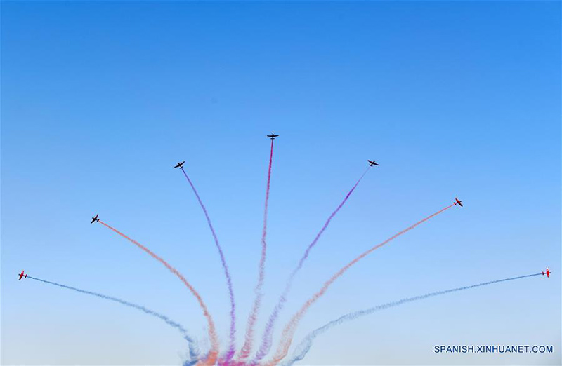 CHANGCHUN, 17 octubre, 2019 (Xinhua) -- El equipo de demostración Sky Wing Air realiza una actuación durante una actividad en celebración del 70° aniversario de la fundación de la fuerza Aérea del Ejército Popular de Liberación (EPL) de China, en Changchun, capital de la provincia de Jilin, en el noreste de China, el 17 de octubre de 2019. La actividad de cinco días, donde la Fuerza Aérea del EPL exhibirá armas y equipos y ofrecerá espectáculos acrobáticos para celebrar su 70° aniversario de fundación, comenzó el jueves. Los espectadores podrán deleitarse con vuelos acrobáticos, espectáculos de paracaidistas, ejercicios de combate de cazas de tercera generación y demostraciones de fuerzas especiales aerotransportadas. Un total de 35 aviones de diez tipos harán presentaciones acrobáticas, como el caza furtivo J-20, el avión de transporte Y-20 y el caza J-16. Además de 19 aviones, la fuerza aérea seleccionó 71 equipos para la exposición estática, con el fin de demostrar su capacidad en combate aéreo, entrega estratégica, alerta y detección tempranas, apoyo de información y defensa aérea y capacidades antimisiles. (Xinhua/Lin Hong)