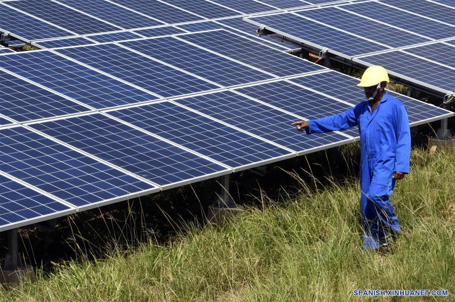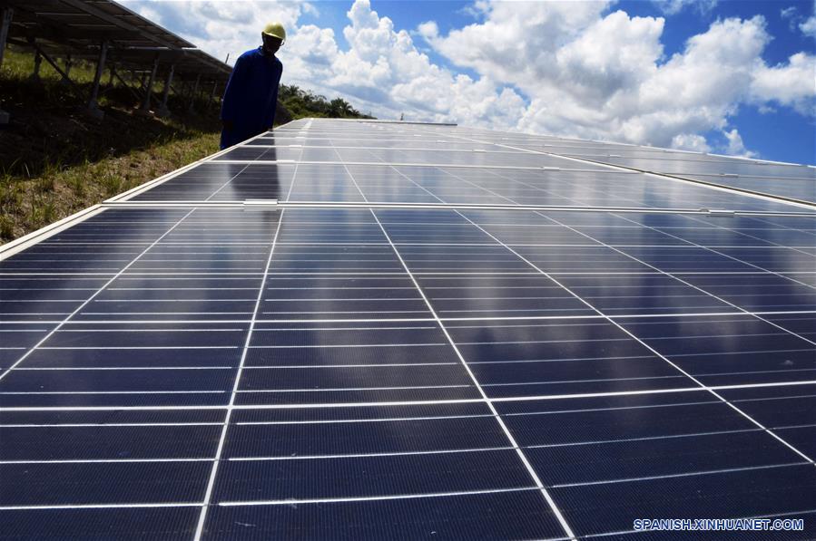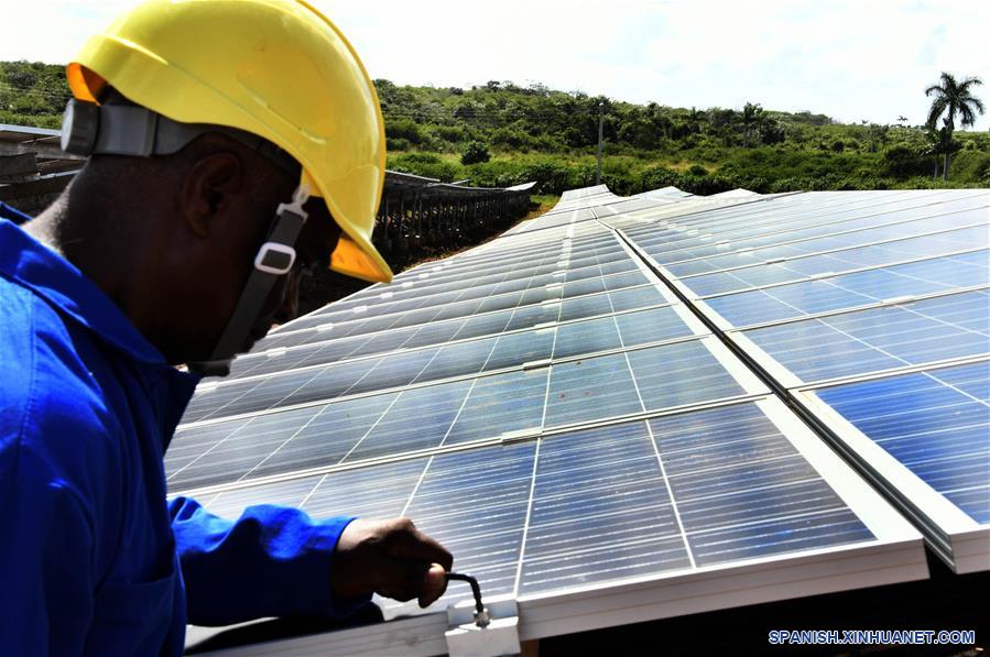 Imagen del 15 de octubre de 2019 de un obrero revisando el funcionamiento de los paneles solares del Parque solar fotovoltaico Pinar 220 A2, en las afueras de la ciudad de Pinar del Río, Cuba. Las banderas de Cuba y China sobresalen sobre el Parque solar fotovoltaico Pinar 220 A2, erigido sobre unas 5,8 hectáreas a unos 10 kilómetros al sur de Pinar del Río, con una donación china de recursos y tecnología. La instalación, que comenzó a operar en febrero de 2018 luego de un a?o y medio de trabajos constructivos, tiene más de 15.500 paneles fabricados por la empresa china Yingli, de la provincia de Hebei, en el norte de China. (Xinhua/Joaquín Hernández)