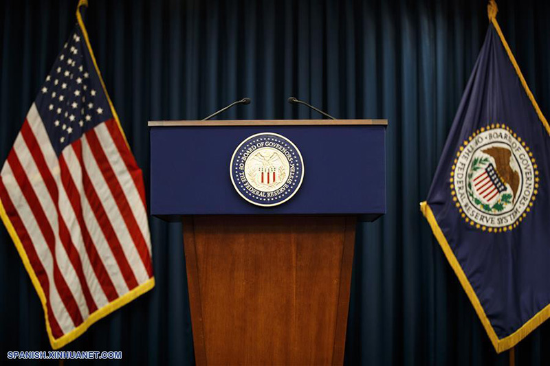 Una conferencia de prensa está lista para ser llevada a cabo en la Reserva Federal de Estados Unidos, en Washington D.C., Estados Unidos, el 30 de octubre de 2019. La Reserva Federal de Estados Unidos recortó las tasas de interés en 25 puntos básicos en medio de una nueva desaceleración en el crecimiento económico de Estados Unidos, el tercer recorte del banco central este a?o. (Xinhua/Ting Shen)