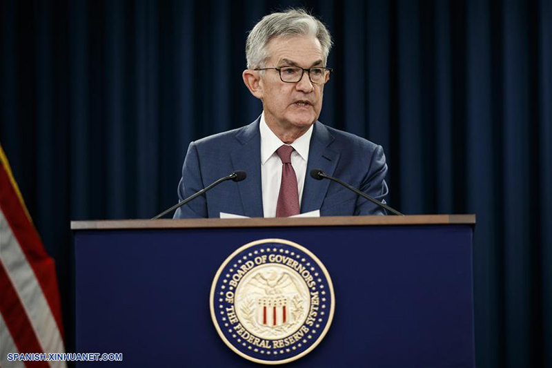 El presidente de la Reserva Federal de Estados Unidos, Jerome Powell, habla en una conferencia de prensa en Washington D.C., Estados Unidos, el 30 de octubre de 2019. La Reserva Federal de Estados Unidos recortó las tasas de interés en 25 puntos básicos en medio de una nueva desaceleración en el crecimiento económico de Estados Unidos, el tercer recorte del banco central este a?o. (Xinhua/Ting Shen)
