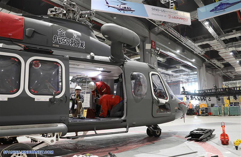 SHANGHAI, 30 octubre, 2019 (Xinhua) -- Trabajadores ajustan un helicóptero que será exhibido en el Centro Nacional de Exposiciones y Convenciones de Shanghai, sede de la segunda Exposición Internacional de Importaciones de China, en Shanghai, en el este de China, el 30 de octubre de 2019. (Xinhua/Fang Zhe)