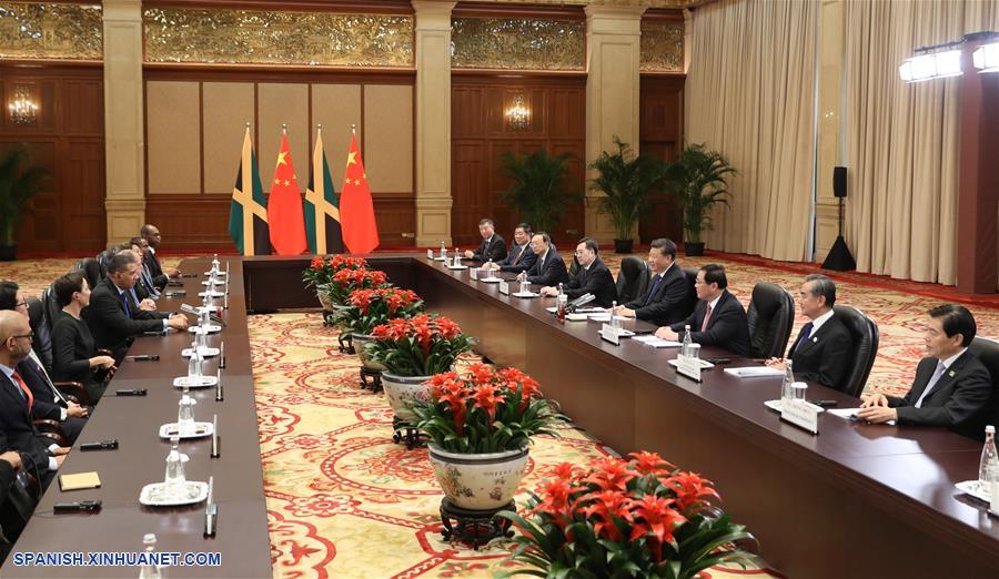 El presidente chino, Xi Jinping, se reúne con el primer ministro jamaicano, Andrew Holness, quien se encuentra en Shanghai para asistir a la segunda Exposición Internacional de Importaciones de China (CIIE), en Shanghai, en el este de China, el 4 de noviembre de 2019. (Xinhua/Ding Lin)