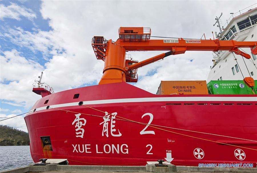 A BORDO XUELONG 2, 4 noviembre, 2019 (Xinhua) -- El rompehielos polar Xuelong 2, o Dragón de Nieve 2, atraca en el puerto de Hobart, Australia, el 4 de noviembre de 2019. Después de un viaje de 20 días, el rompehielos chino, que se encuentra en la 36a expedición antártica del país, atracó el lunes en el puerto de Hobart en Australia. Es la primera vez que atraca en un puerto extranjero desde que comenzó su viaje inaugural. (Xinhua/Liu Shiping)