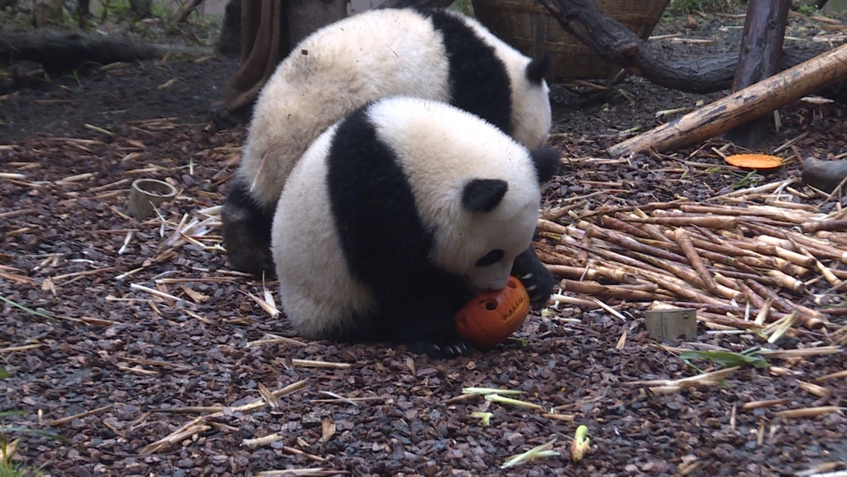 Los pandas juegan con calabazas en la Base de Investigación y Cría de Panda Gigante en Chengdu, provincia de Sichuan. (Foto: chinadaily.com.cn)