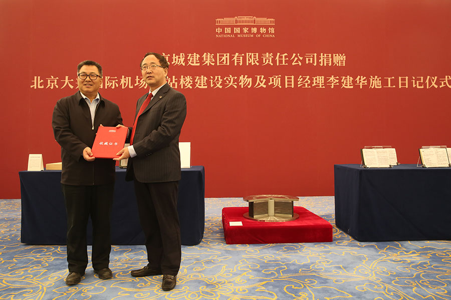Wang Chunfa (izquierda), director del Museo Nacional de China, presenta un certificado a Chen Daihua, presidente de Beijing Urban Construction Group Co Ltd el 5 de noviembre de 2019. [Foto de Jiang Dong / chinadaily.com.cn]
