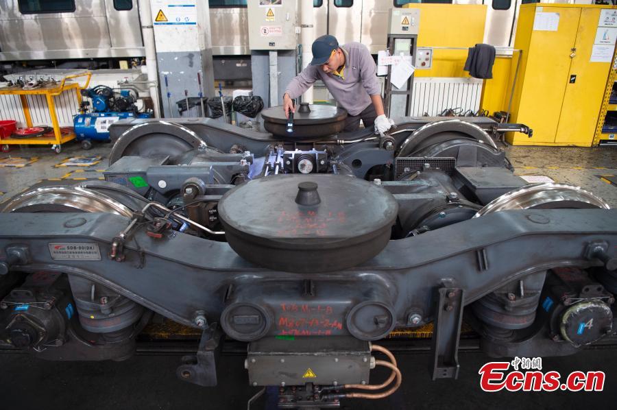 Los técnicos realizan tareas de manteniendo de los vagones de la línea 4 del metro de Beijing en un taller, el 5 de noviembre de 2019. En el taller se puede llevar a cabo el mantenimiento de 86 vagones de la línea 4 y de la línea de tránsito rápido que conecta el distrito Daxing, sur de la ciudad. (Foto: China News Service/Hou Yu)