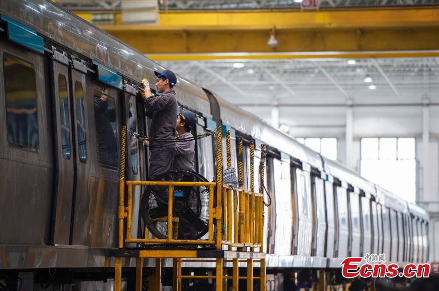 Los técnicos realizan tareas de manteniendo de los vagones de la línea 4 del metro de Beijing en un taller, el 5 de noviembre de 2019. En el taller se puede llevar a cabo el mantenimiento de 86 vagones de la línea 4 y de la línea de tránsito rápido que conecta el distrito Daxing, sur de la ciudad. (Foto: China News Service/Hou Yu)