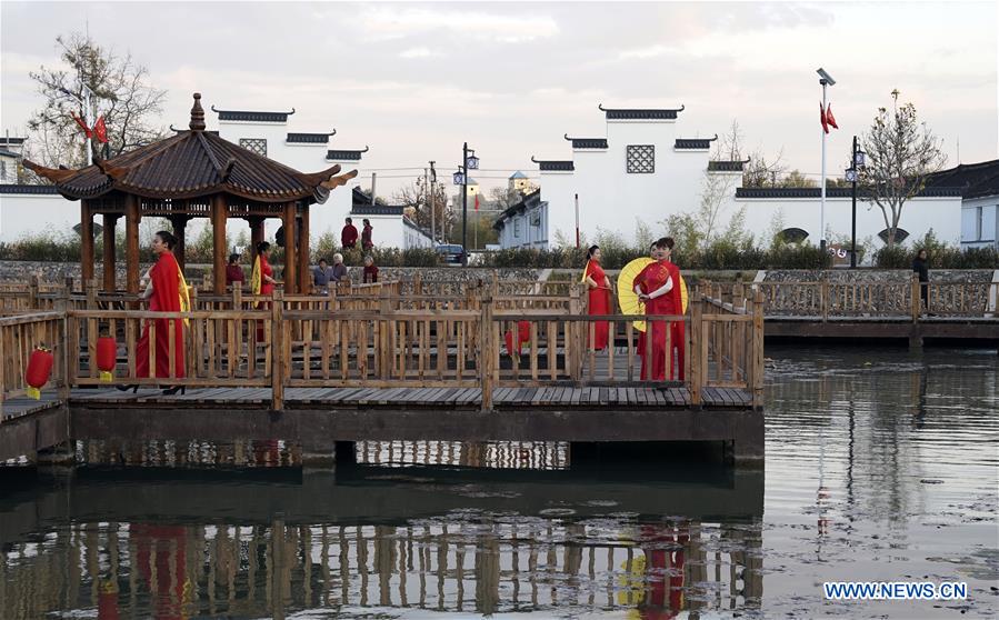 Varias aldeanas que hacen de modelos caminan sobre una pasarela de madera en un parque de la aldea Houtaizi de Qian'an, provincia de Hebei, el 10 de noviembre del 2019. El gobierno local ha hecho grandes esfuerzos para mejorar la vida en las zonas rurales este a?o. Después de una transformación y una construcción de alto nivel, un pozo de residuos se ha convertido en un hermoso parque con agua limpia y edificios antiguos, convirtiéndose en un lugar público atractivo para la recreación y el entretenimiento. (Xinhua / Jin Liangkuai)