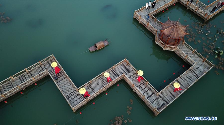 Qian'an, Hebei, 11/11/2019 (El Pueblo en Línea) - Varias aldeanas que hacen de modelos caminan sobre una pasarela de madera en un parque de la aldea Houtaizi de Qian'an, provincia de Hebei, el 10 de noviembre del 2019. El gobierno local ha hecho grandes esfuerzos para mejorar la vida en las zonas rurales este a?o. Después de una transformación y una construcción de alto nivel, un pozo de residuos se ha convertido en un hermoso parque con agua limpia y edificios antiguos, convirtiéndose en un lugar público atractivo para la recreación y el entretenimiento. (Xinhua / Jin Liangkuai)