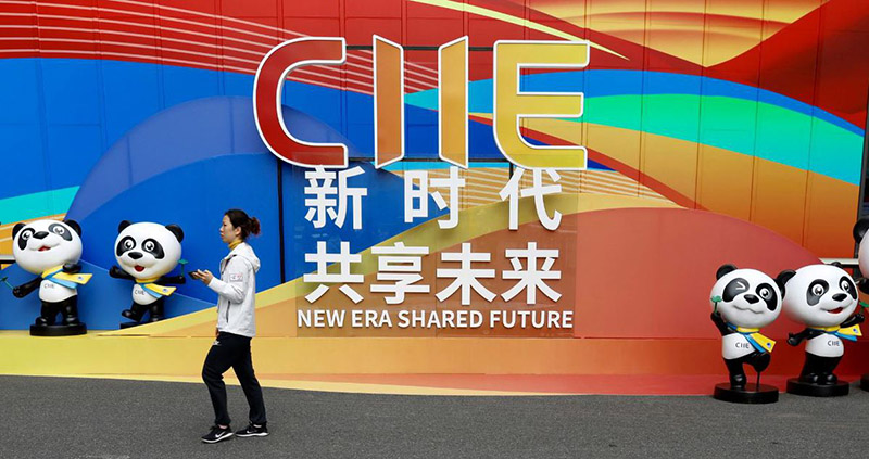 Un peatón pasa por el Centro Nacional de Exposiciones y Convenciones (Shanghai), sede de la II Exposición Internacional de Importaciones de China. [Foto por Zhu Xingxin / China Daily]