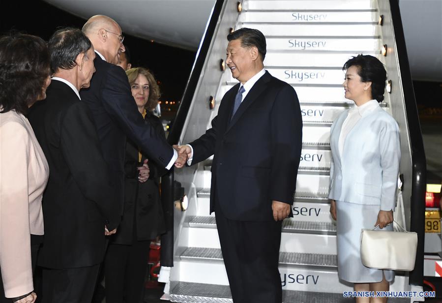 El presidente chino, Xi Jinping, y su esposa Peng Liyuan son recibidos por altos funcionarios griegos a su llegada al aeropuerto de Atenas, Grecia, el 10 de noviembre de 2019. El presidente chino, Xi Jinping, llegó el domingo a Grecia para una visita de Estado de tres días para consolidar la amistad tradicional y fortalecer la cooperación entre los dos países. (Xinhua/Xie Huanchi)