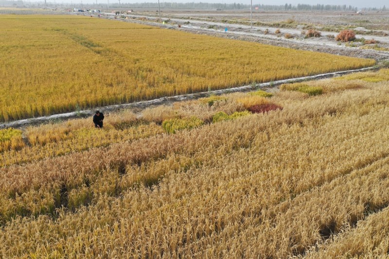 El arroz de mar desarrollado por un equipo liderado por Yuan Longping, destacado experto chino en arroz híbrido, logró un rendimiento de 546,74 kilogramos por mu (0,07 hectáreas) en Yopurga, Región Autónoma de Xinjiang Uygur. [Foto: proporcionada a chinadaily.com.cn]