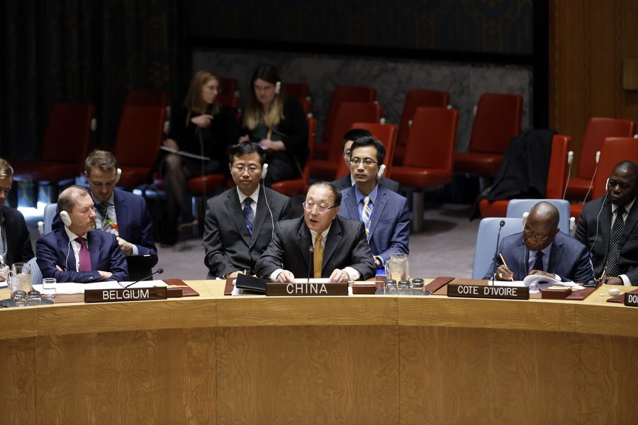El representante permanente de China ante la Organización de las Naciones Unidas (ONU), Zhang Jun (c-frente), habla en un debate del Consejo de Seguridad sobre el papel de la reconciliación en paz y mantenimiento de seguridad en la sede de la ONU en Nueva York, el 19 de noviembre de 2019. (Xinhua/Li Muzi)