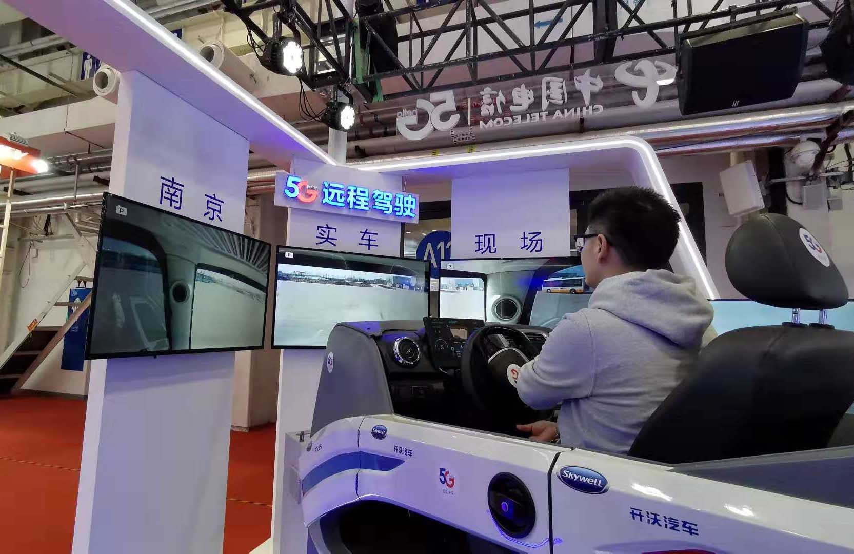 China Telecom presentó su vehículo de control remoto en la exposición. El vehículo, a cientos de millas de distancia en Nanjing, ofrece una reacción en tiempo real basada en su se?al enviada desde el simulador en el Centro de Convenciones de Beijing. La retroalimentación en tiempo real del simulador y las imágenes en vivo transmitidas desde las cámaras instaladas en el vehículo dificultan la diferenciación de una experiencia de conducción real.