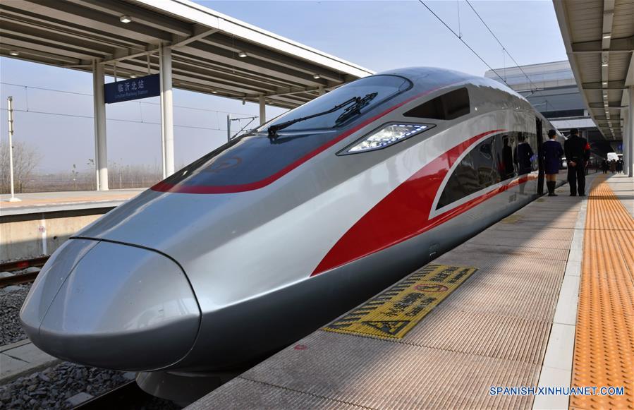 Imagen del 26 de noviembre de 2019 del tren bala G5587 listo para salir en la Estación Linyi Norte, en la provincia de Shandong, en el este de China. Una línea ferroviaria entró el martes en funcionamiento en la provincia de Shandong, en el este de China, trayendo las monta?as Yimeng, una antigua base revolucionaria, a la red ferroviaria de alta velocidad de rápido desarrollo del país por primera vez. La sección recién lanzada, que une a Rizhao y Qufu, ambas en Shandong, se extiende 235 kilómetros con una velocidad dise?ada máxima de 350 kilómetros por hora, reduciendo el tiempo de viaje entre las dos ciudades a 1 hora 14 minutos, de las 3 horas y 13 minutos actuales. (Xinhua/Zhu Zheng)