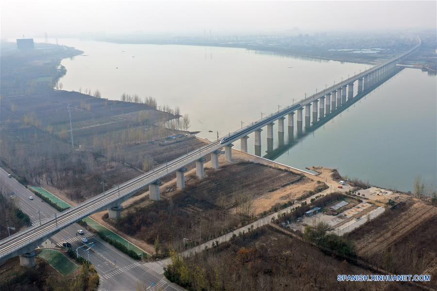 Vista aérea del 26 de noviembre de 2019 de un tren bala pasando por el Gran Puente Yihe en Linyi, provincia de Shandong, en el este de China. Una línea ferroviaria entró el martes en funcionamiento en la provincia de Shandong, en el este de China, trayendo las monta?as Yimeng, una antigua base revolucionaria, a la red ferroviaria de alta velocidad de rápido desarrollo del país por primera vez. La sección recién lanzada, que une a Rizhao y Qufu, ambas en Shandong, se extiende 235 kilómetros con una velocidad dise?ada máxima de 350 kilómetros por hora, reduciendo el tiempo de viaje entre las dos ciudades a 1 hora 14 minutos, de las 3 horas y 13 minutos actuales. (Xinhua/Zhu Zheng)