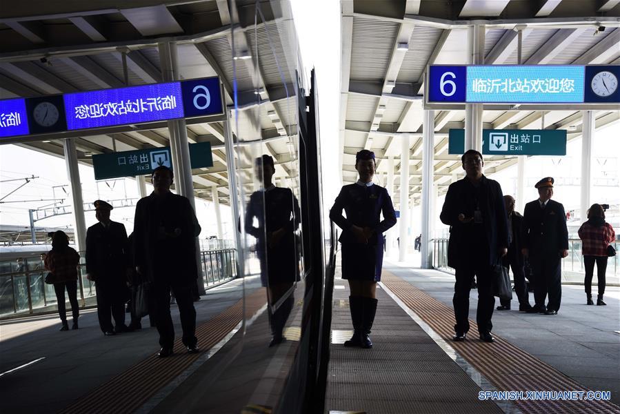 Pasajeros abordan un tren bala en la Estación Linyi Norte, en la provincia de Shandong, en el este de China, el 26 de noviembre de 2019. Una línea ferroviaria entró el martes en funcionamiento en la provincia de Shandong, en el este de China, trayendo las monta?as Yimeng, una antigua base revolucionaria, a la red ferroviaria de alta velocidad de rápido desarrollo del país por primera vez. La sección recién lanzada, que une a Rizhao y Qufu, ambas en Shandong, se extiende 235 kilómetros con una velocidad dise?ada máxima de 350 kilómetros por hora, reduciendo el tiempo de viaje entre las dos ciudades a 1 hora 14 minutos, de las 3 horas y 13 minutos actuales. (Xinhua/Wang Kai)