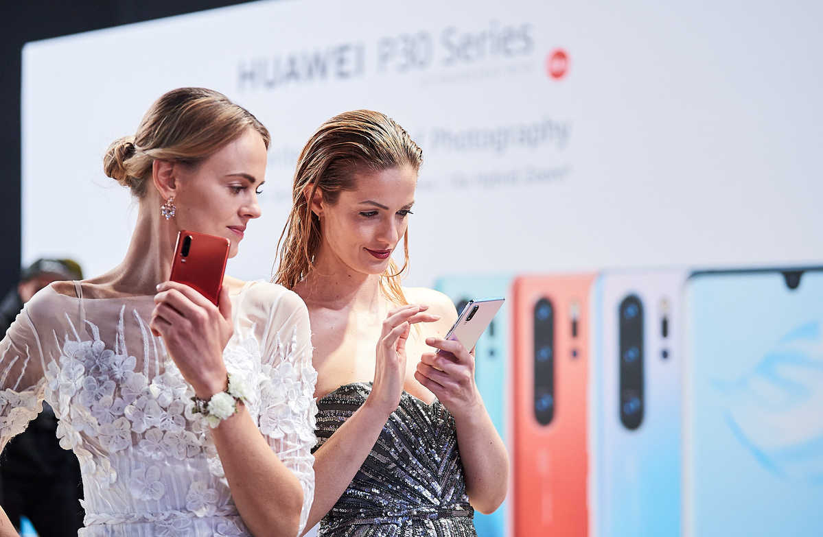 Dos modelos muestran los teléfonos inteligentes de la serie Huawei P30 durante el lanzamiento del nuevo producto en París, Francia, a principios de este a?o. [Foto proporcionada a China Daily]