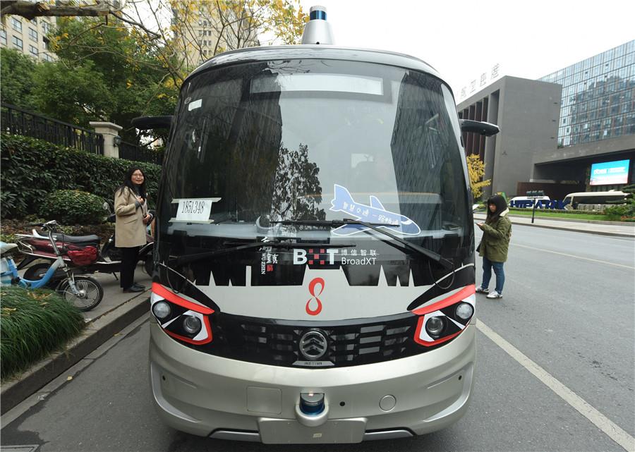 Los ciudadanos hacen una foto a un minibús sin conductor con tecnología 5G en Hangzhou, provincia de Zhejiang, este de China, el 26 de noviembre de 2019. [Foto / Asianewsphoto]