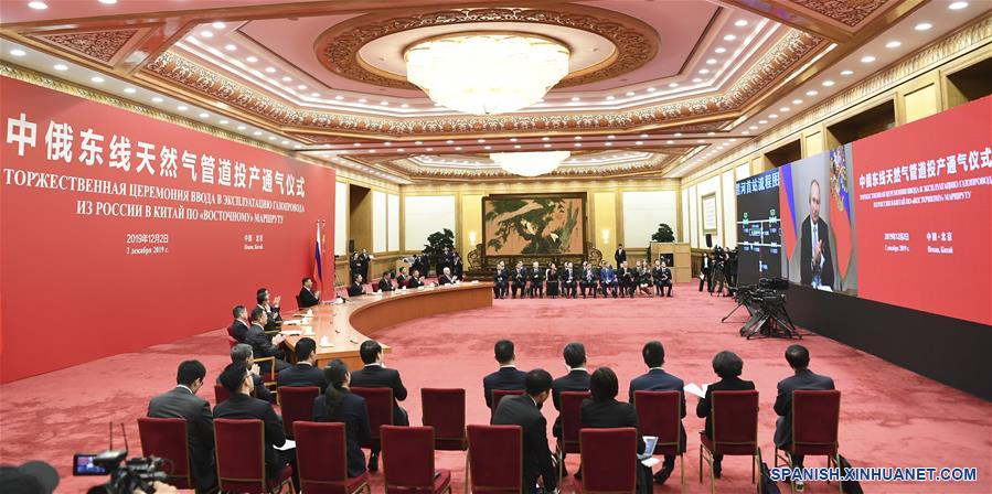 El presidente chino, Xi Jinping, realiza una videollamada con su homólogo ruso, Vladimir Putin, mientras los dos jefes de Estado presencian conjuntamente la ceremonia de lanzamiento de la línea oriental del gasoducto China-Rusia, en Beijing, capital de China, el 2 de diciembre de 2019. (Xinhua/Xie Huanchi)
